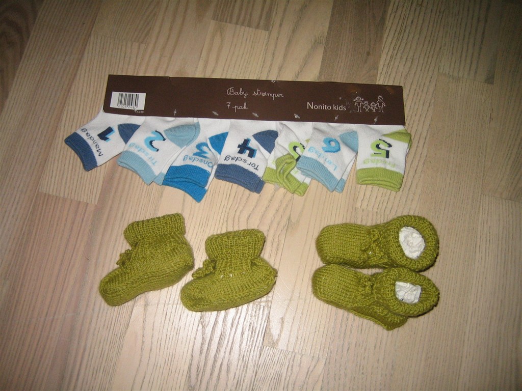 2 par hjemmestrikkede hjemmesko i to forskelllige størrelser ca. str 0-3mdr og 3-6 mdr (og to forskellige grønne - billedet snyder)