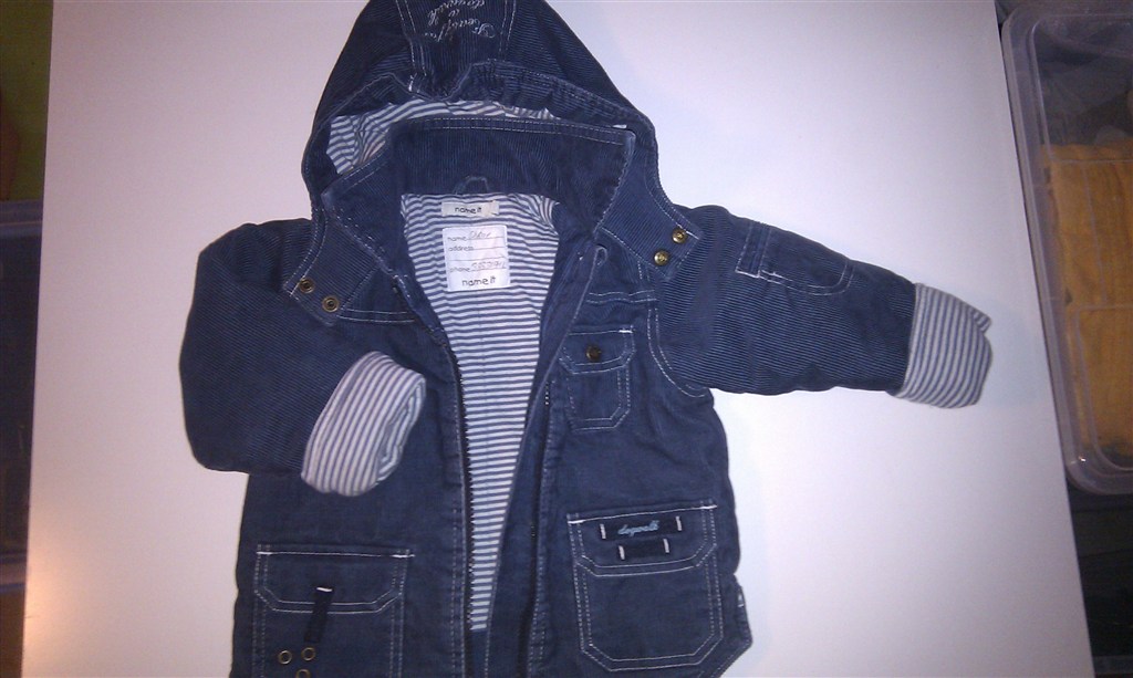 Overgangsjakke/forårsjakke i str. 74 i mørkeblåt fløjl med lynlås. Stribet foer, vatteret, hætten kan tages af. Ingen slid, pletter eller huller. Fra Name it. Bemærk der er skrevet navn i. Kommer fra røg- og dyrefrit hjem. Kom med et bud.