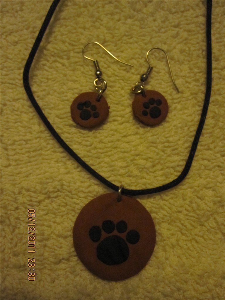 Hjemmelavet sæt med halskæde og øreringe i "fimoler" motiv af dyrepoter, fået af en tidliger veninde, sælges for 50 kr