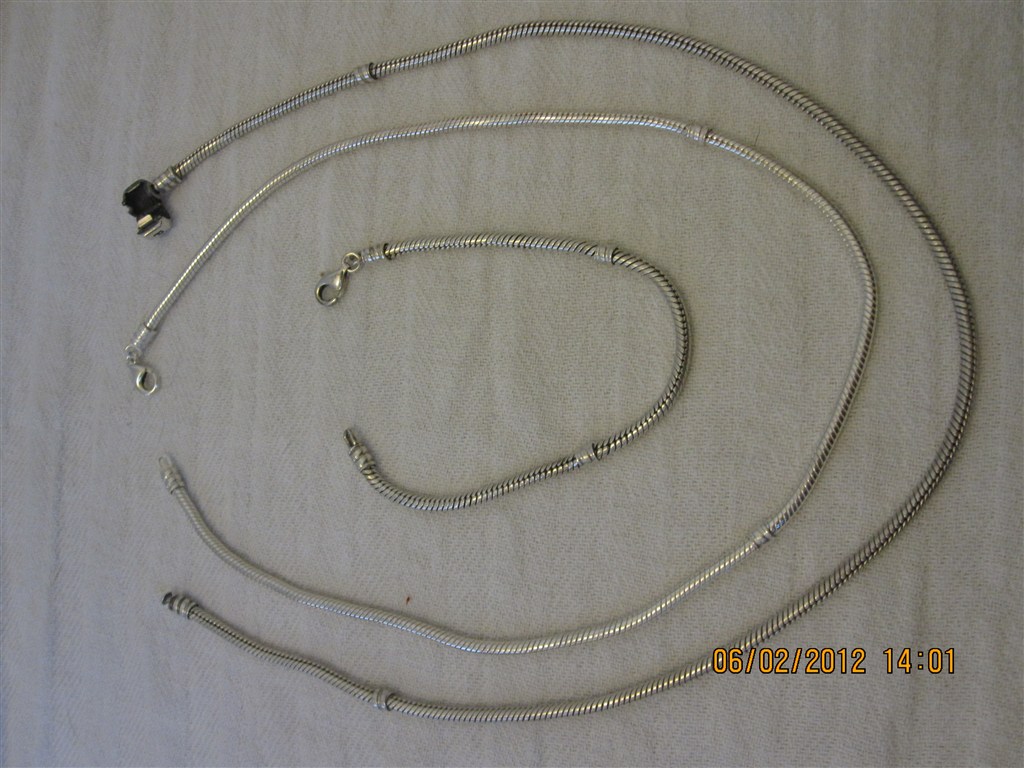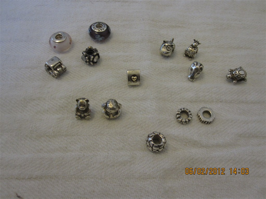 Der ud over har jeg en del Pandora, 2 forskellige halskæder i sølv, et armbånd i sølv, og ca 11 forskellige led(2 i sken og resten i sølv) priser er forskelliget alt efter hvad man er interesseret i og om der er flere af tingene man gerne vil have, sælger gerne som sæt eller ligende da halskæderne jo ikke er sjove uden led på.. (et par af leddene på billedet er solgt så spørg endelig)