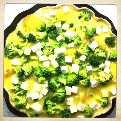 Jeg spiser ikke kød, så her laver vi den oftest med porre, majs og tomat, og så en super grov bund. Med salat til.