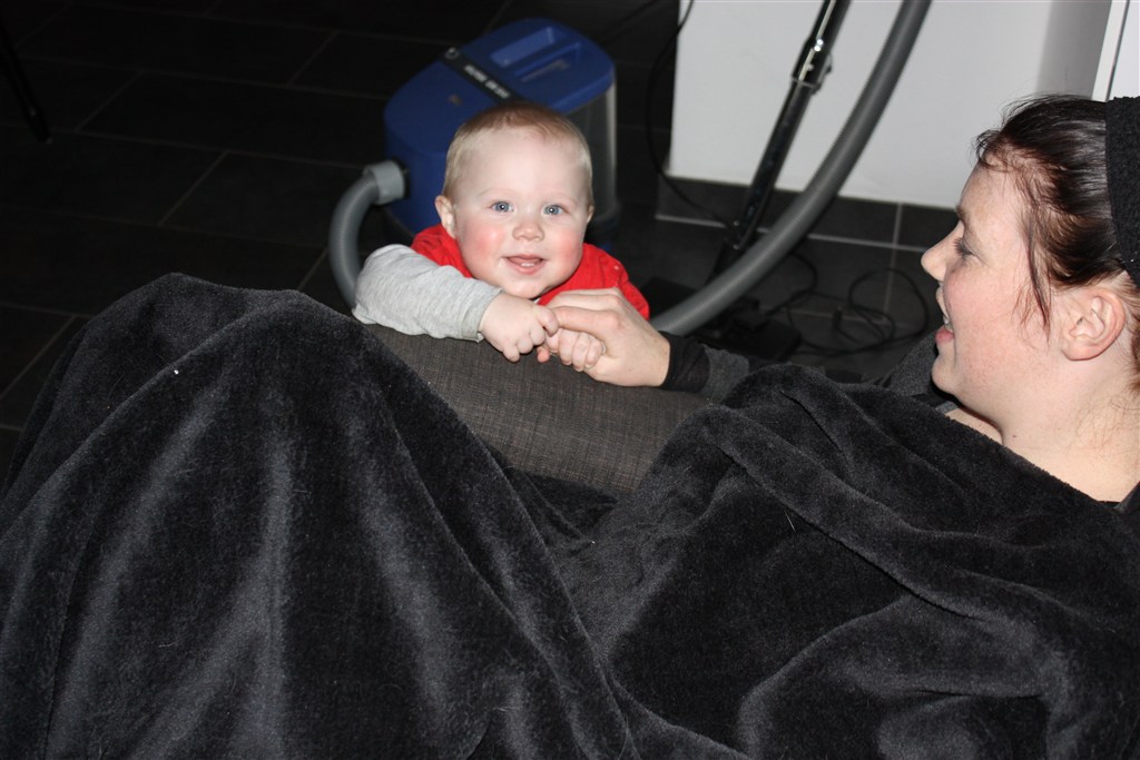 Milan kravler da... når han har møvet sig som en såret soldat hen til en stol/sofa hvad det måtte være... så kravler han lige 4 skridt og rejser sig... Han går med Brio vognen og skubber alt foran sig og går...