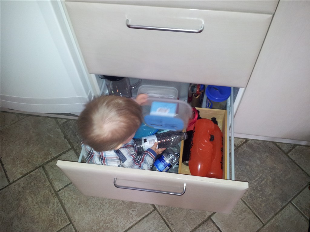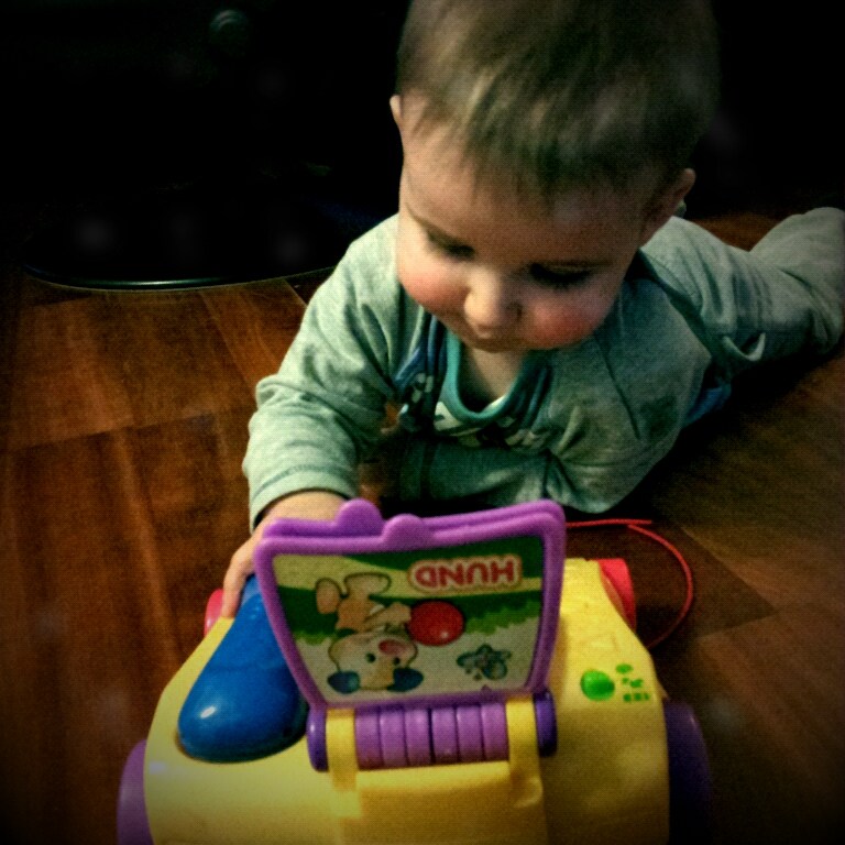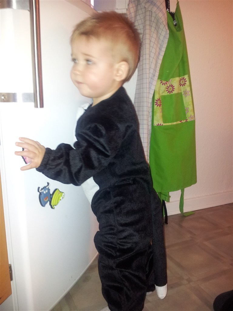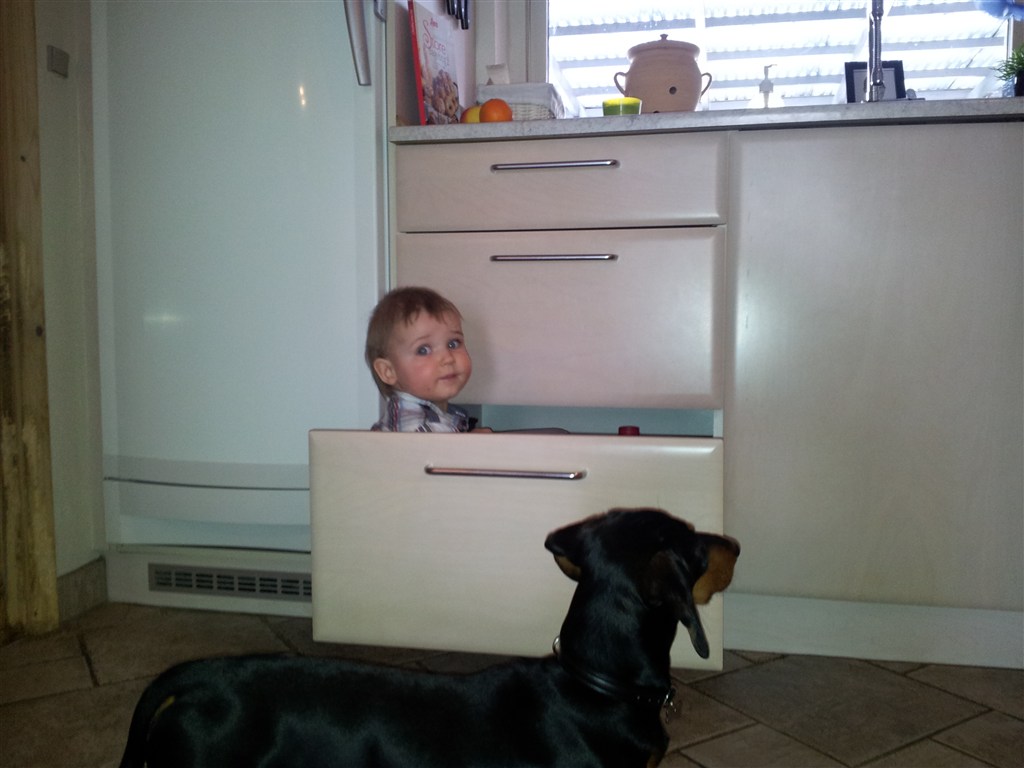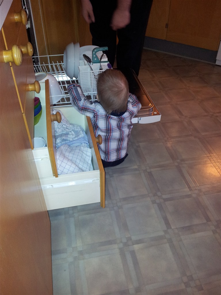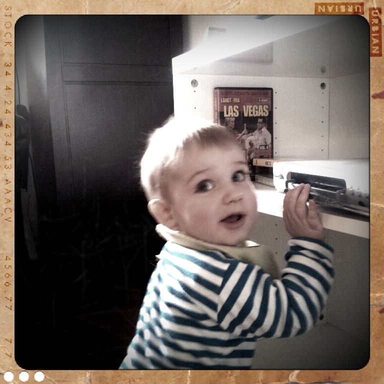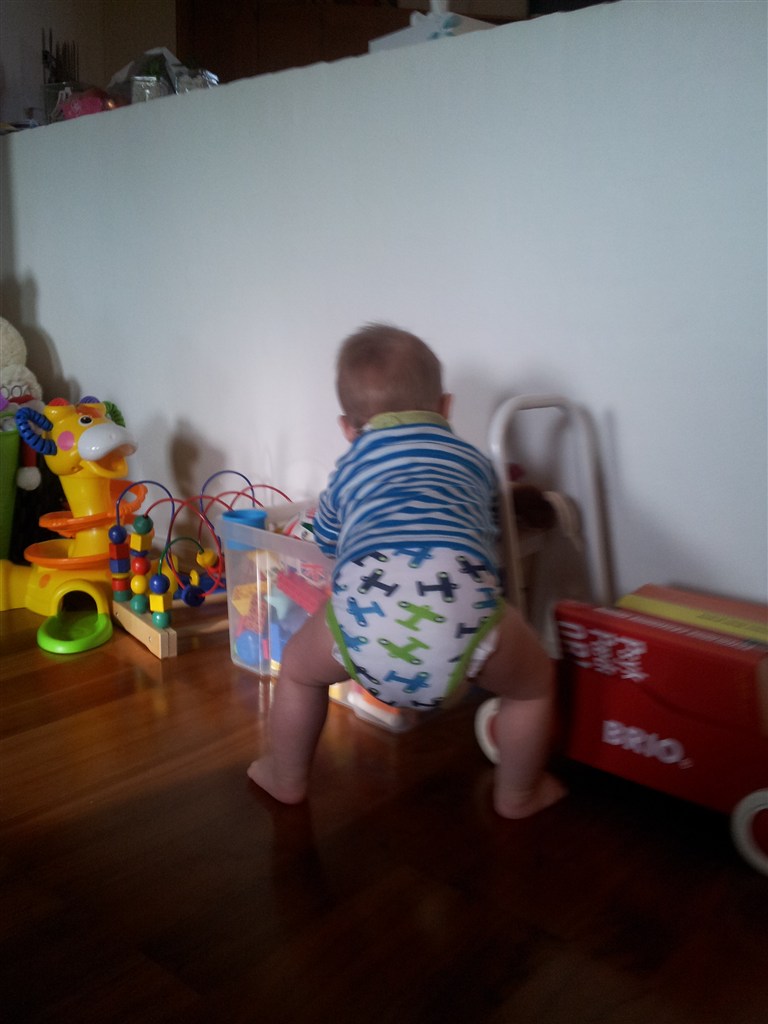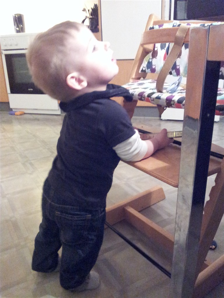 Felix vil gerne stå og gå, det der med at sidde ned er ganske undervurderet. Han rejser sig ved sine kasser med legetøj, sin gåvogn, puder mm. Han kan endnu ikke rejse sig ved sofabord og lignende, men stiller vi ham, bliver han gerne stående længe, eller går en tur rundt om bordet. Han spadserer lange ture med sin højstol - eller nåh ja, indtil han rammer en væg og skriger hysterisk og slår på stolen, indtil vi vender ham og dem og han kan gå videre...