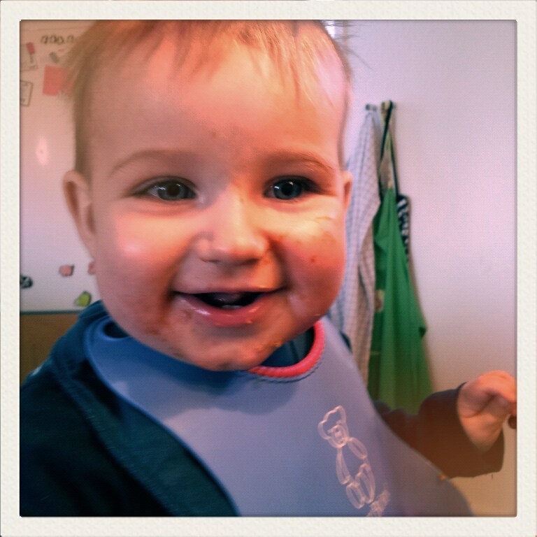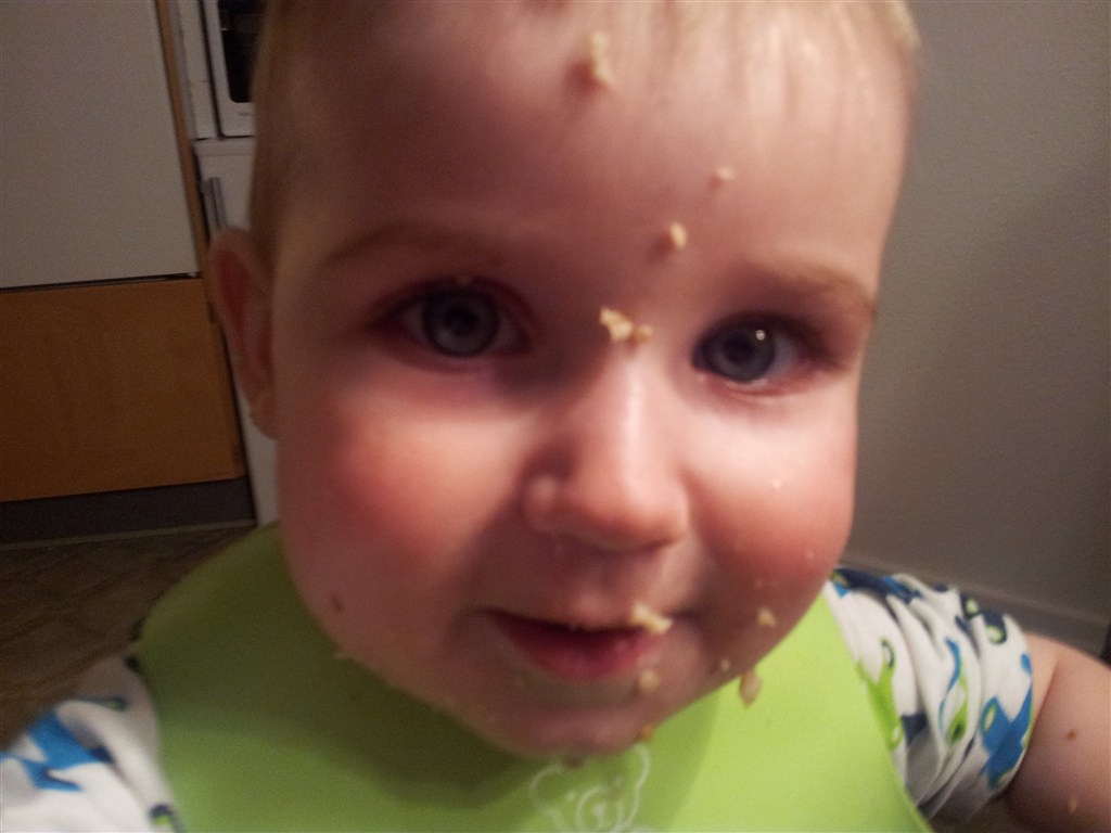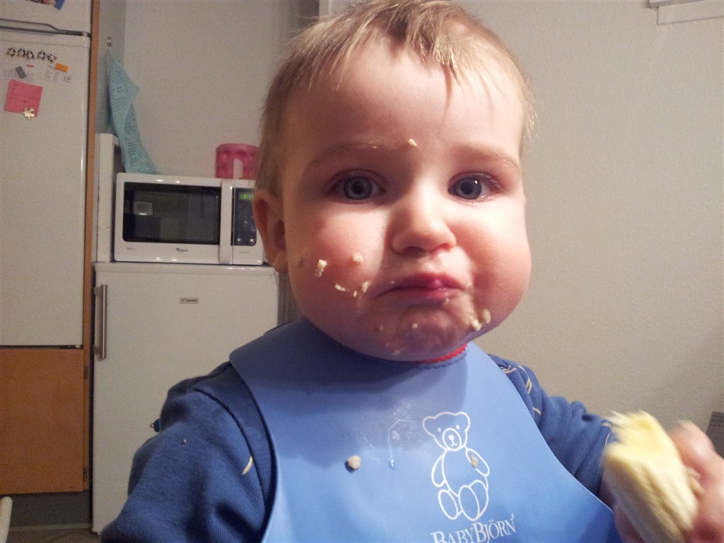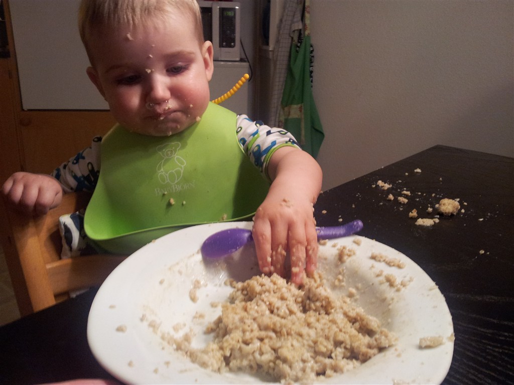 Han gider ikke spise selv med ske, læner sig tilbage og venter på jeg mader ham istedet. Det er ok indtil videre, så ved jeg han får mad!