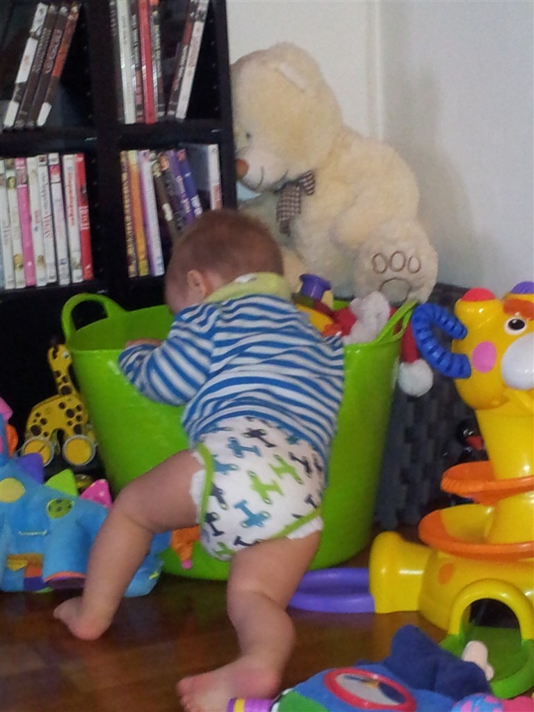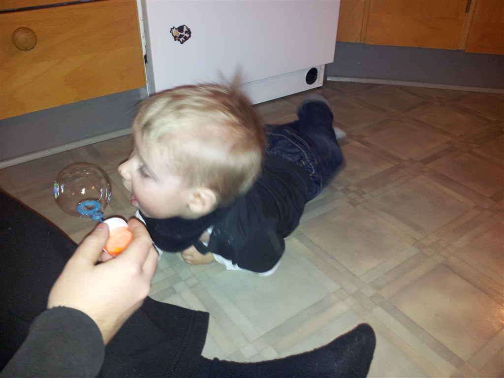 Han kravler stadig ikke, og jeg tror ikke han kommer til det, før han har lært at gå. Han kommer fremad og det er det vigtigste. Han kan kravle op af vores trappe, ca. 15 trin, helt uden hjælp. Vi går lige bag ved ham og har også tit en hånd under numsen, så vi er sikre på han ikke lige smutter et trin ned og slår tænder/hage/mund. Ned har han ikke knækket koden til endnu.