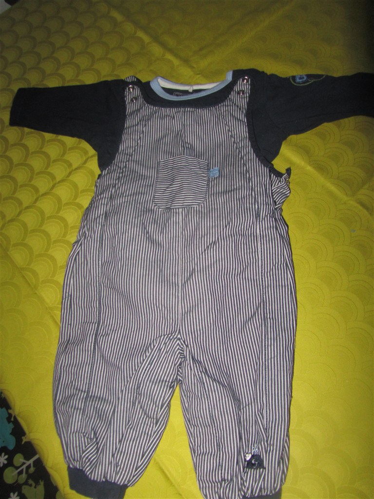 Billede 2: Næsten nyt sæt med mørkeblå bluse og stribede overalls str 62. Nypris 260 kr. Sælges for 100 75 kr
