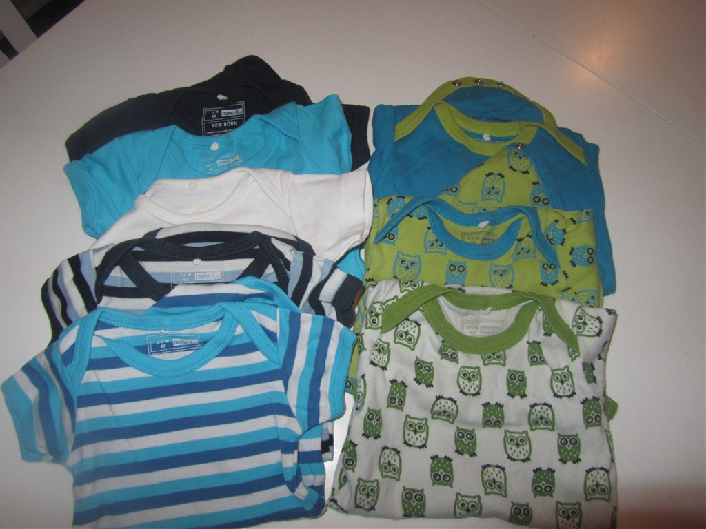 Billede 3: 5 stk kortærmede bodyer (venstre række) og 3 langærmede (højre række). Gode men brugt. Nypris 240 kr. Sælges for 90 60 kr. SOLGT