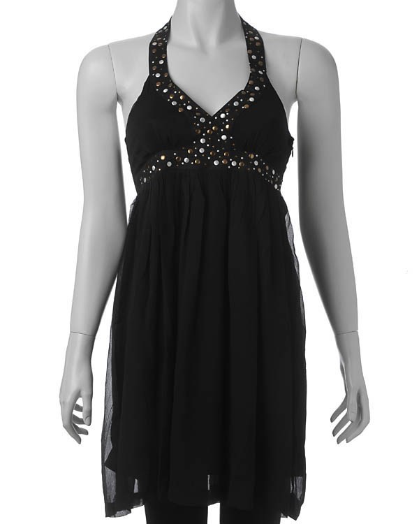 Hvad er str. og pris på den sorte "kjole" med lidt bar ryg?