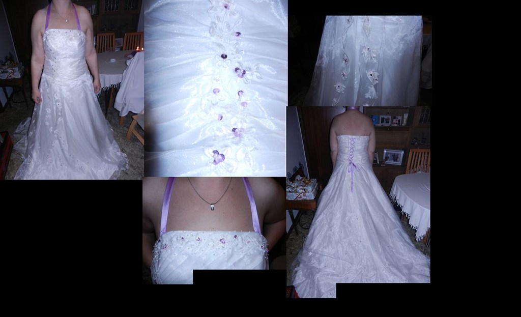 Rigtig flot og anderledes brudekjole i str.46/48. Kjolen er speciallavet med lilla pailetter og bånd. Overdelen er corsage med snører i ryggen. Skørt medfølger. Slæbet er også med broderi. Fra 2010