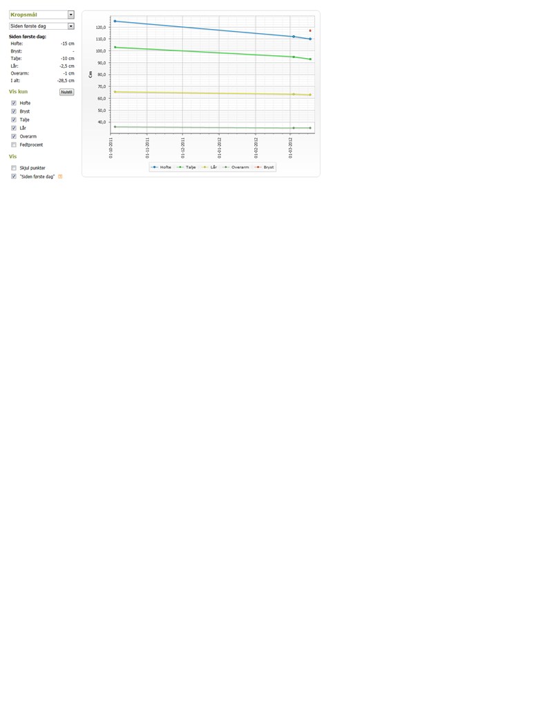 Anonym skriver: Ja okay billeder er meget små, men det første er kropsmål og der er røget 28,5 cm ialt .. 15 cm på hofte, 10 på talje, 2,5 på lår og 1 på arm.. Det andet billede viser at jeg har tabt 7 kg