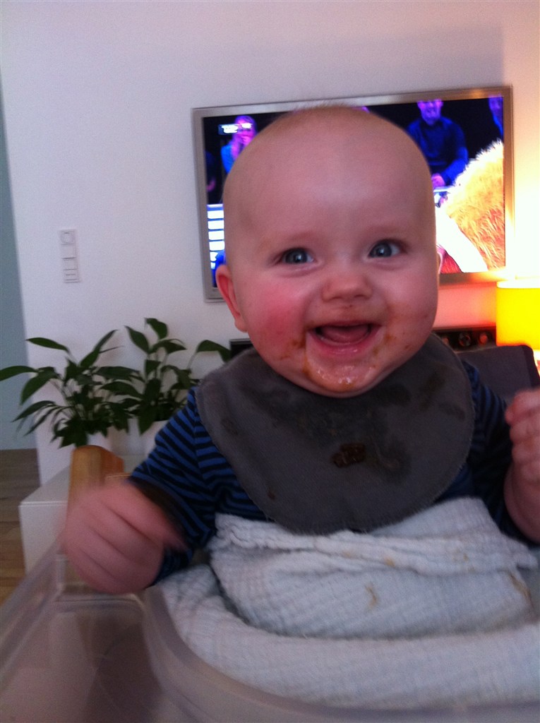 Vi er startet på almindelig mad, men han spiser det ikke rigtig endnu, han smager bare på det, og leger med det