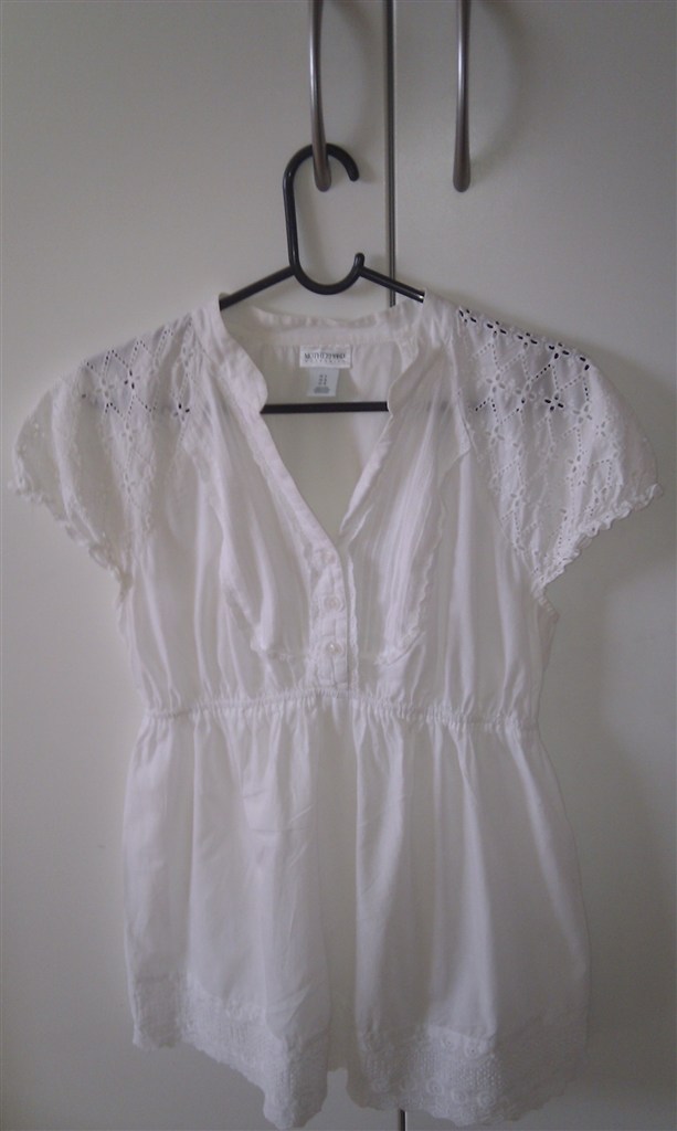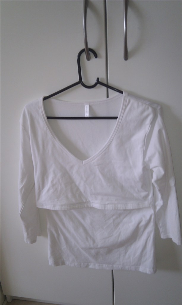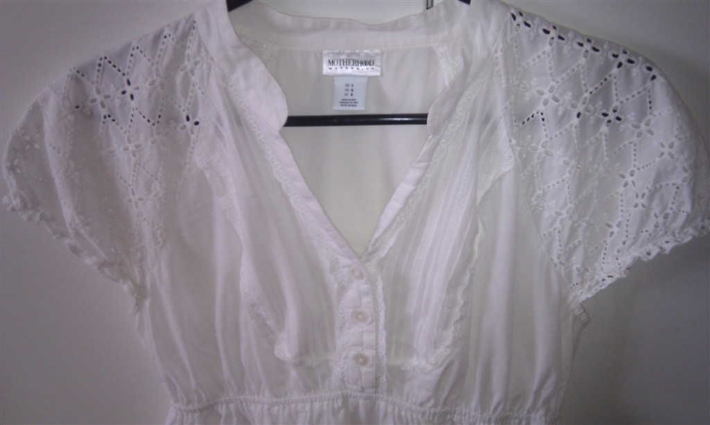 Hvid top fra Motherhood Maternity med korte ærmer, str. L, (har en mikroskopisk plet midt på).