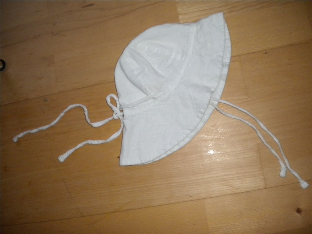 Lækker hvid sommerhat fra Wheat, har justerbar snor bagtil og kan derfor tilpasses - der står ingen størrelse i! Min datter brugte den fra 6-8 måneder.