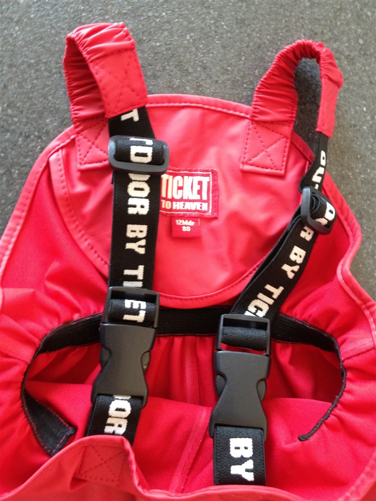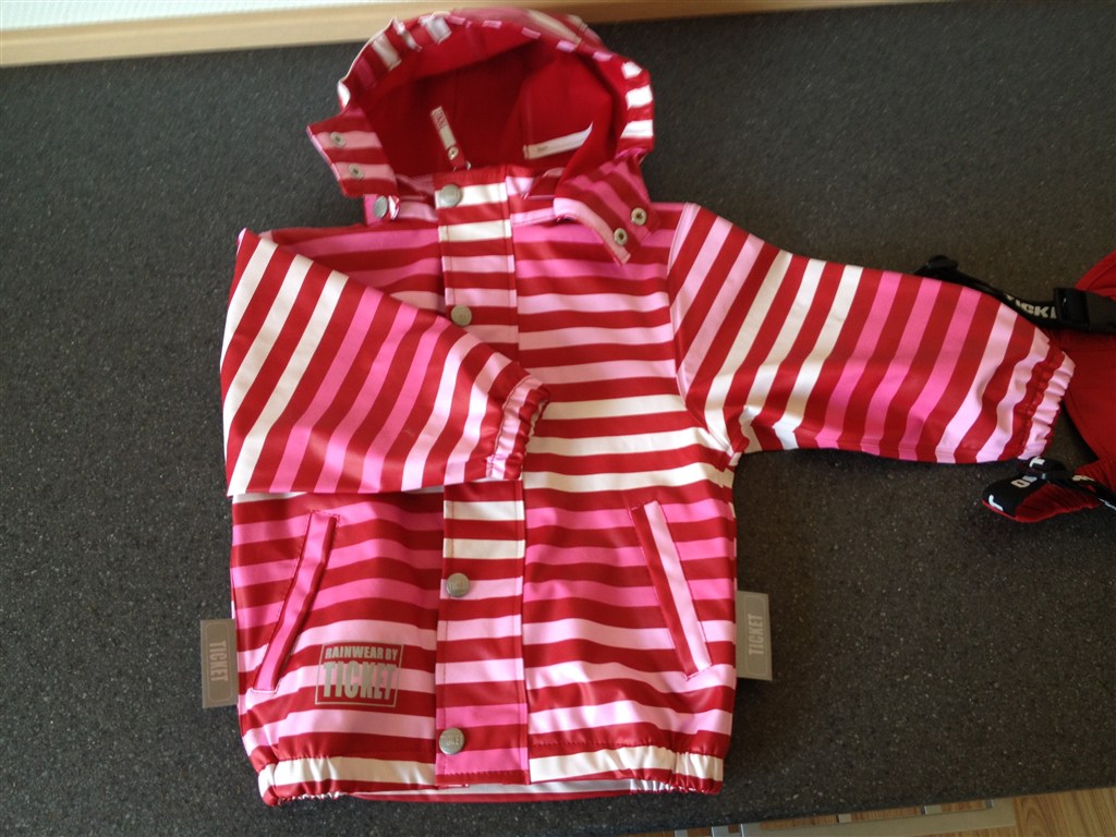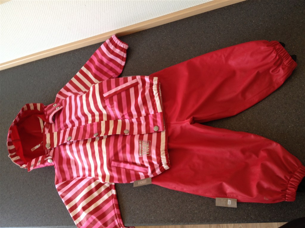 Emilie havde dette fine regnsæt sidste år. Det er str. 80 (12 måneder) Det er kun brugt fra 1. september og til flyverdragt sæson, så det fremstår faktisk som nyt. Ingen huller, pletter eller slid.