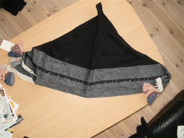 helt ny Trekantet tørklæde i sort og denim med sort klunkebånd, multifarvede kvaste i enderne. helt ny Mål: 150 x 80 centimeter (uden kvaste).mærket: cream pris 75 kr