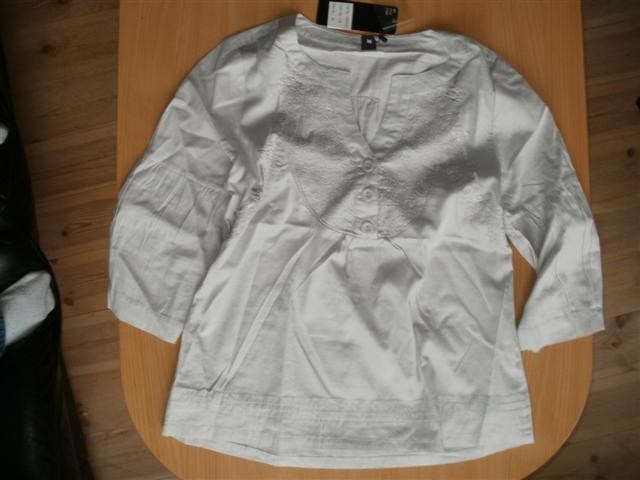 helt ny Kort tunika med broderi på brystet .Den har 3/4 ærmer og små læg forneden, den er lyse grå. mærket: etui str m pris 100 kr