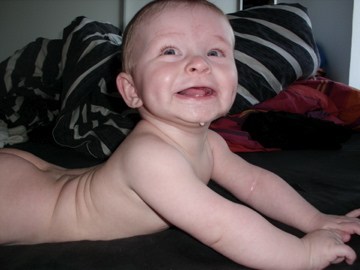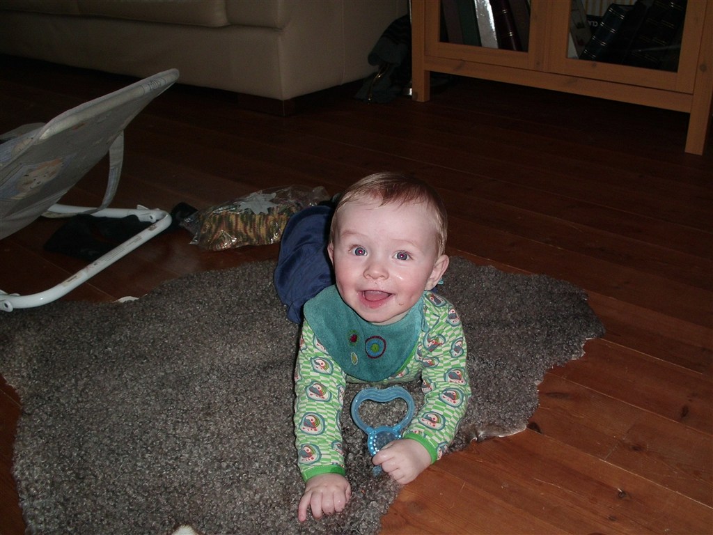 Og han har bare taget et ordentligt ryk efter den her feber tur. Før ville han bare sidde på gulvet og lege med sine ting, men nu vil han bare ligge på maven igen, og møve rundt