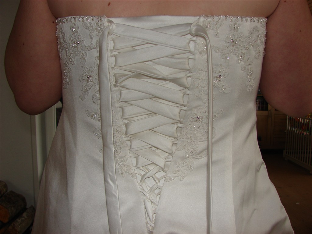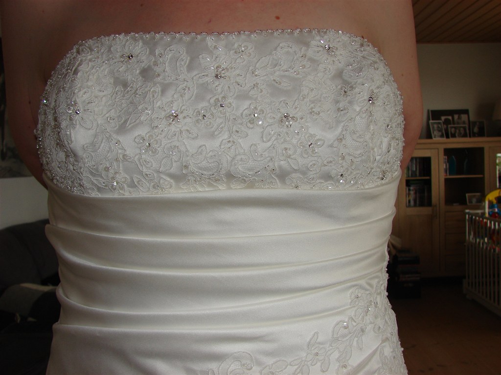 Denne smukke brudekjole er blevet for stor til sælger på trods af snørrelukning, og den sælges derfor fuldstændig ubrugt (prismærke sidder stadig på). Med masser af smukke broderier med perler.