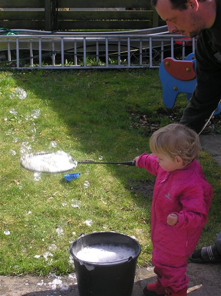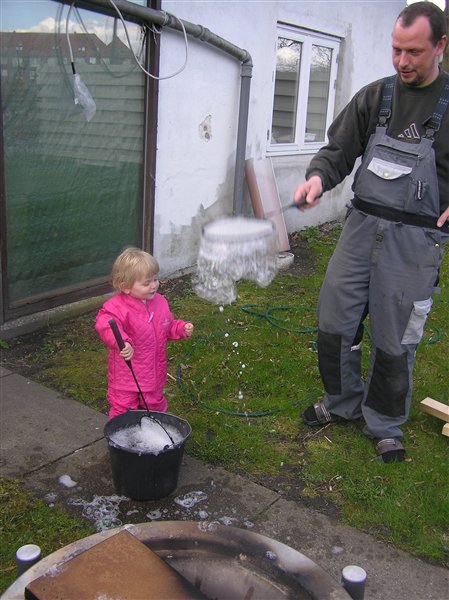 Det bedste var dog da Michael pludselig troppede op med en spand med vand og opvaskemiddel, og greb en bunke ketcher...han så nemlig fjernsyn for dig i søndags og så hvordan Far gris lavede sæbebobler...og aj et hit! Se lige her!