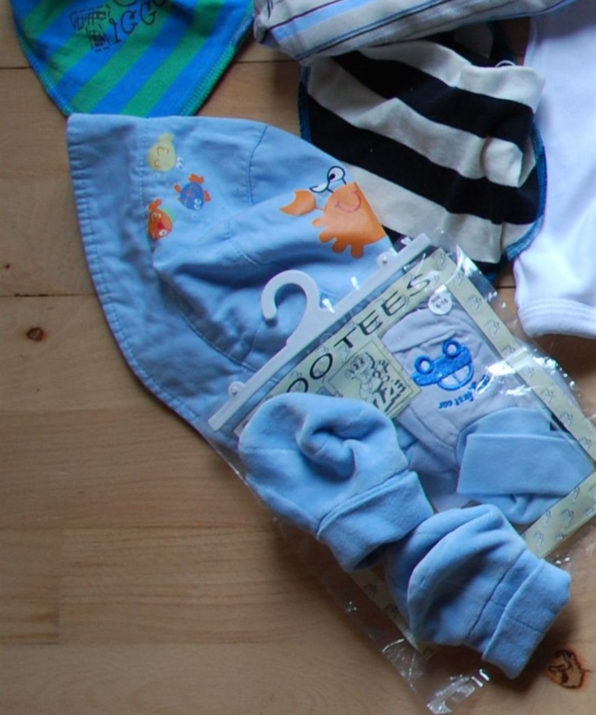 2 stks. tykke savlesmække, 2 stk. sko/sokker str. 62/68 og 1 bøllehat.
