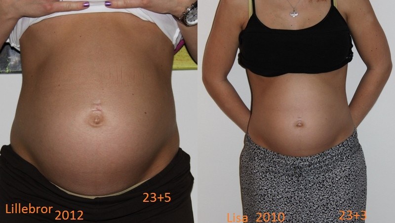 Syntes det er lidt svært at se forfra, da det ene er tættere på end det andet. Men wauw en fin mave.. OG sjovt med sådan en sammenligning. Er der ellers andre forskelle på din første og anden graviditet, eller ligner de hinanden umiddelbart?