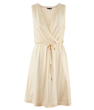 En knælang kjole uden ærmer i jersey med fastsyet slå-om foran. Kjolen har elastik i taljen og et aftageligt bælte.