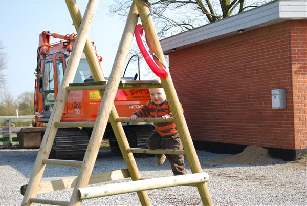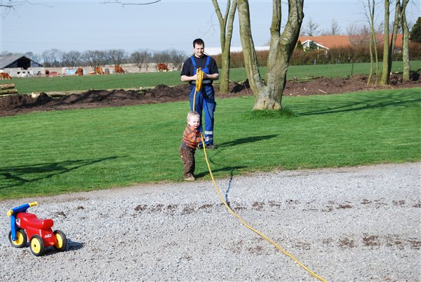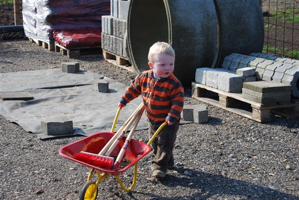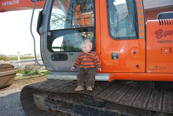 Jo vi har jo været ved at lave lidt om i haven her i påsken så manden har lejet en gravemaskine og knægten er jo helt vild med sådan nogen. Han har været med farmand ud at grave og alt muligt.