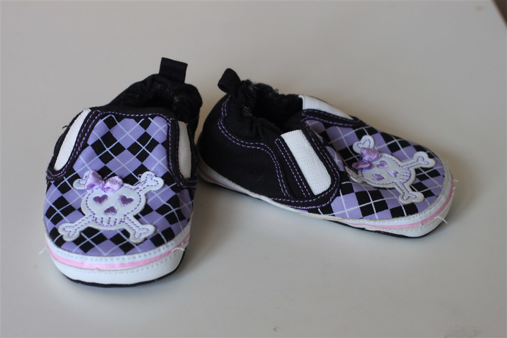 3. Fine små "hjemmesko" med et dødningehoved motiv med sløjfe på. Aldrig brugt. 35 kr. Ved ikke hvor de er fra, og størrelsen er ca. 6-9 mdr.