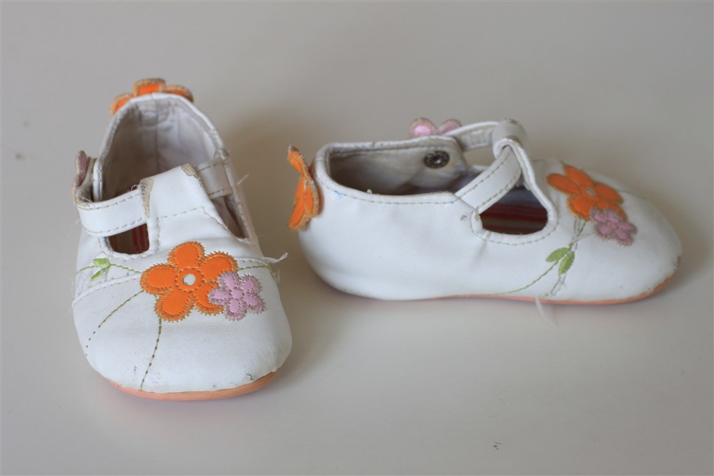5. Fine hvide baby-sandaler med blomstermotiv. Ved ikke hvor de er fra (gave) Rigtig god bund.. Standen er ok, men man kan se at de er brugte. 60 kr.