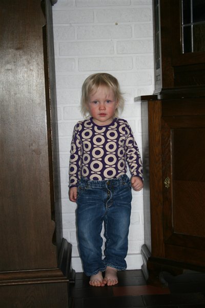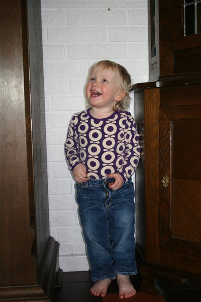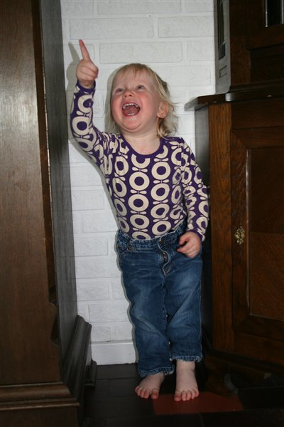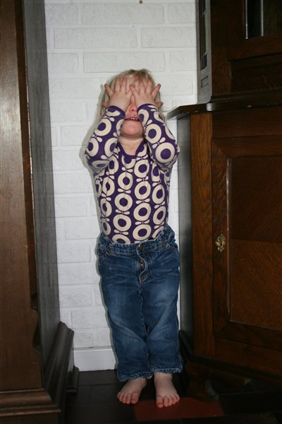Men prøv lige at se, hun er da ikke til at stå for. Hun leder forresten efter sine strømper. Ikke noget hun er særlig god til, for hun bliver ved med at sige, at de skal være derinde i hullet. I stedet gemmer hun sig så for far.