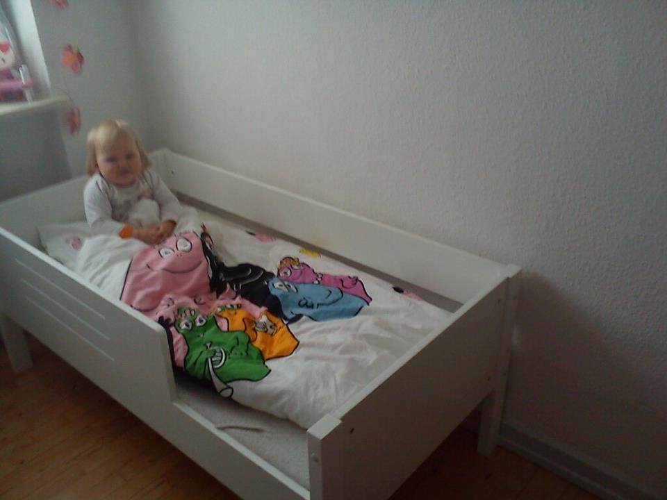 1: Mille sidder lige og får sig et alvorsord med far2: Nyder at man har fået stor pige seng