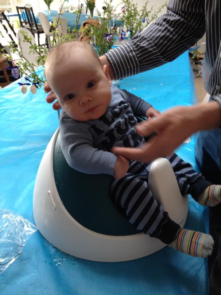 Jeg har tit Lukas sidende i den mens jeg laver mad. Så sidder han og følger med på køkkenbordet med legetøj på bordet.