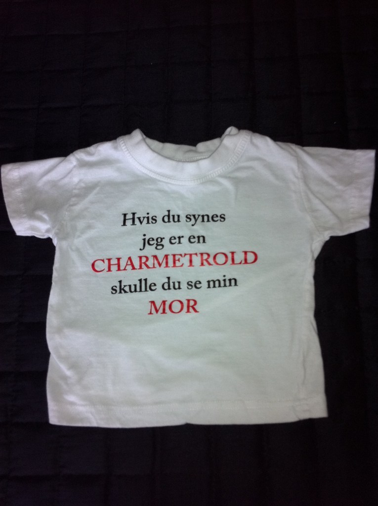 32: charmetrold bluse (kun brugt få gange, trykket er lidt skævt, men ses ikke når den er på sys jeg) 15 kr