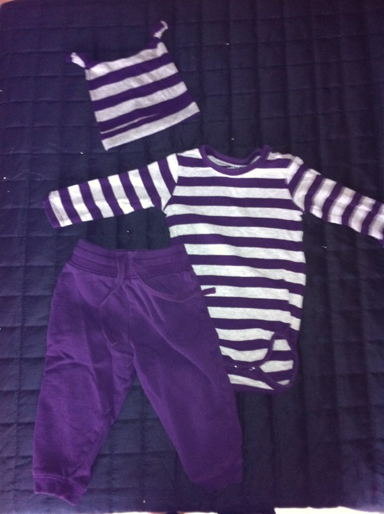 det lille og grå stribede sæt med hue: god men brugt 50 kr