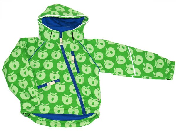 SUPER fed og lækker forårs/efterårs-jakke fra småfolk i fin limegrøn farve med lysegrønne æbler, skrå lynlås og blåt foer.
