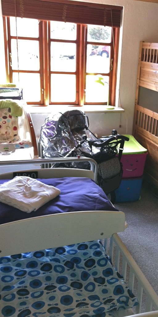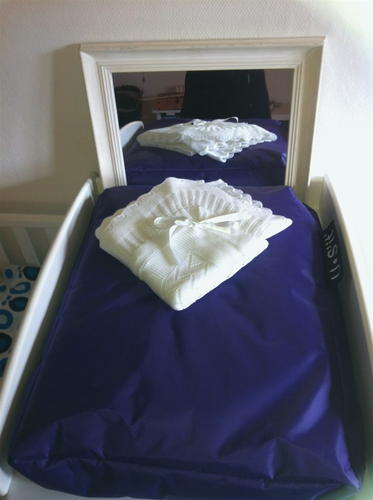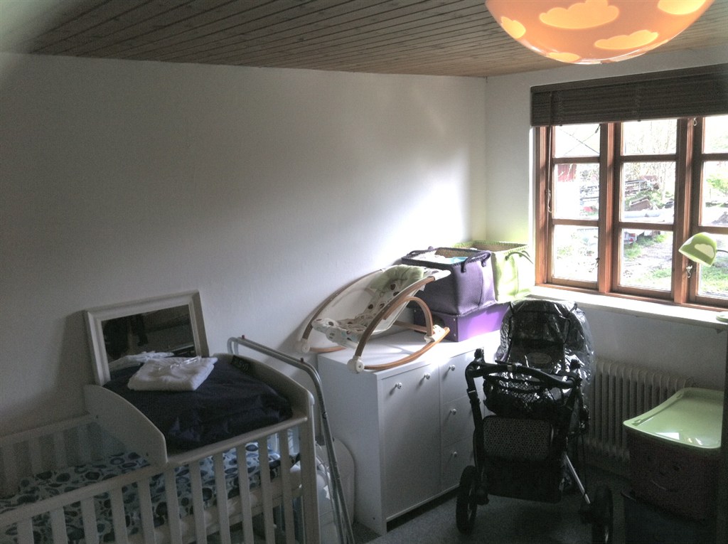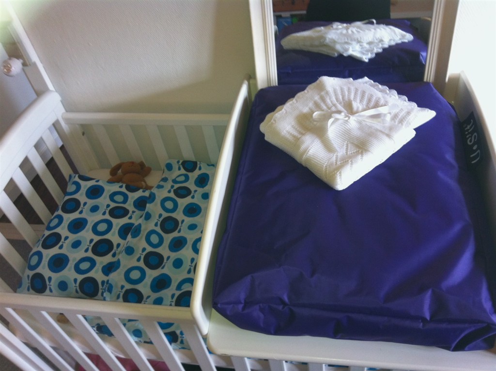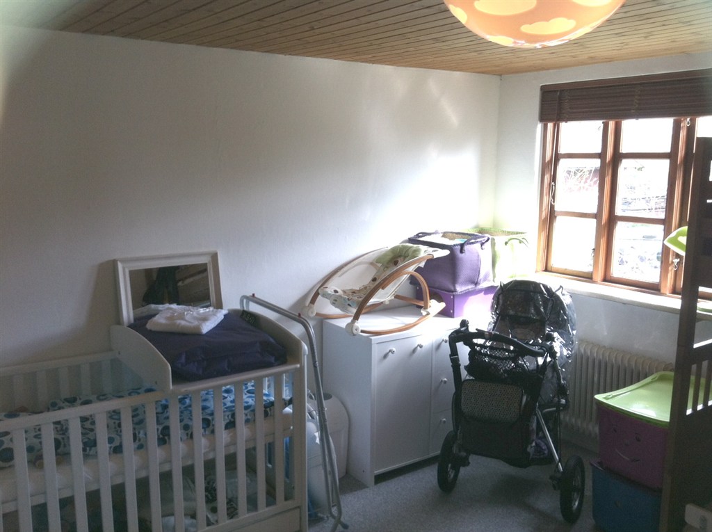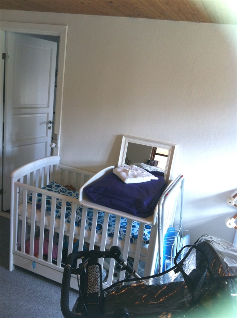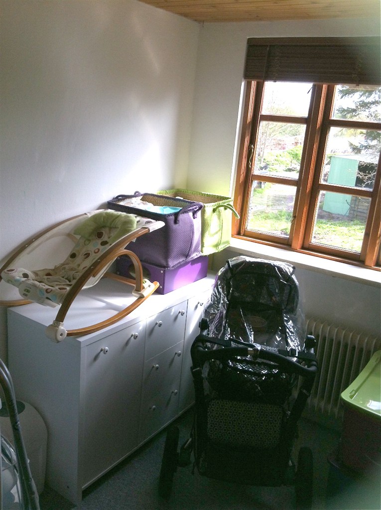Vi mangler kun at sætte svævehylderne op - så fletkasserne kan komme på plads med bleer og engangsklude :0) Våglæggerlagen til hængevuggen, barnevogn og tremmesengen skal vi også lige have i hus.