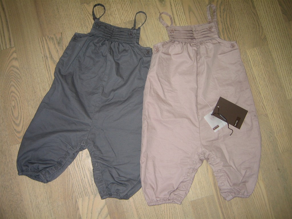 Norlie buksedragter str 62. den kan spændes ud i to forskellige knappehuller så vi brugte dem også som str 68. Farven hedder bleg lavendel, men synes mest som grålig. den anden er som billedet. Den lavendel er vasket 4 gange, den rosa to gange. Desværre røg den ene del af trykknappen i midten af skridtet på den lavendel efter anden brug. Man kan sagtens bruge den ude, men det er kun den ene del hvor knappen skal op der mangler. den på den anden side mangler ikke, så man kan bare købe enm ny i en sybutik og sætte på. man kan se det på billedet:-)