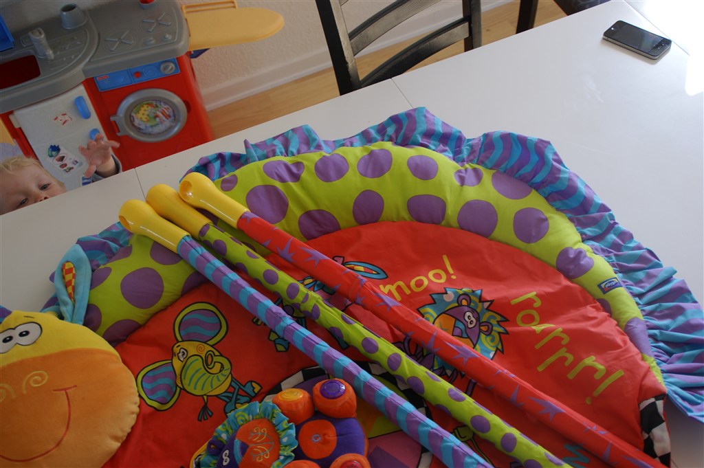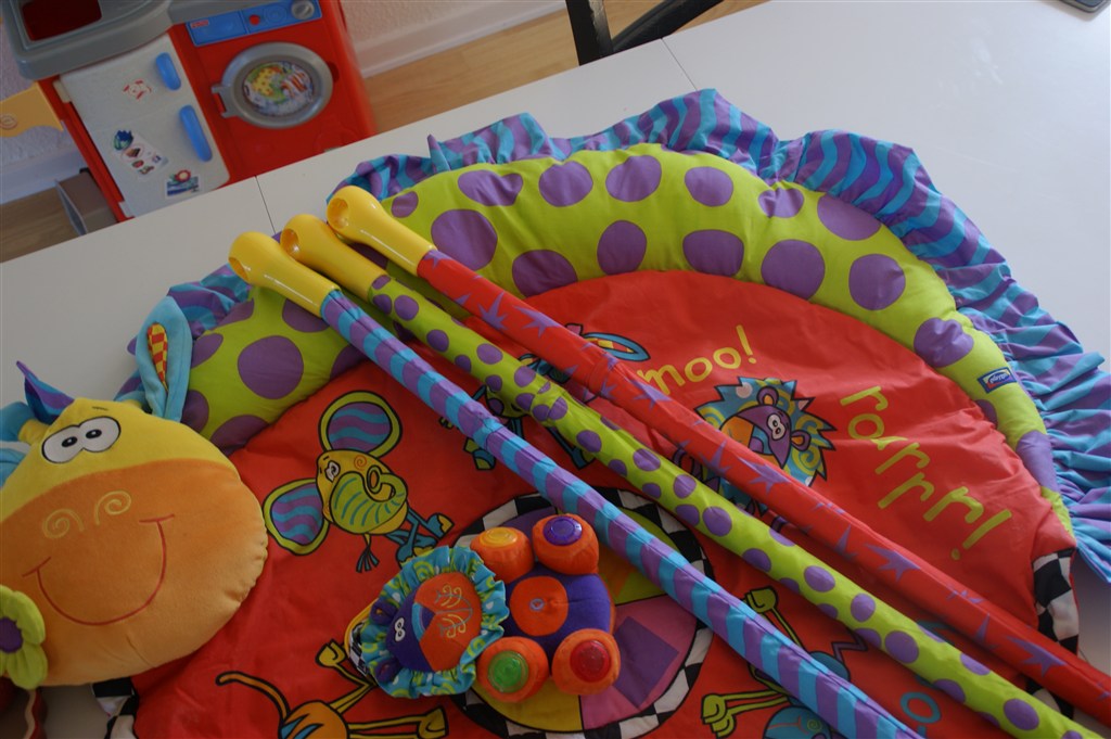 Fint tæppe med tre bøjler over. Kanten på tæppet lyder som plastposer og koens hoved er dejlig blødt. Der medfølger en løve, der spiller forskelligt musik, enten ved at puffe til den, eller trykke den på maven.