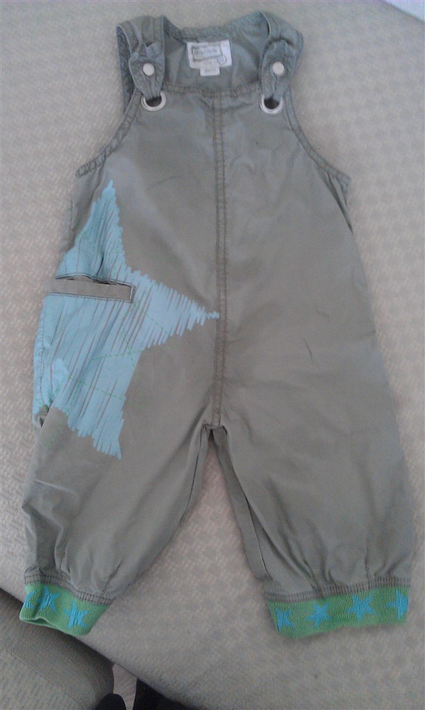 Det er str 74, der er desværre lidt fedtplette på, de kan ses på billedet. De er mest ovrre på det ben til højre. Man ser det hvis man kigger efter det, men når bukser er på og i bævægelse ser man det slet ikke.