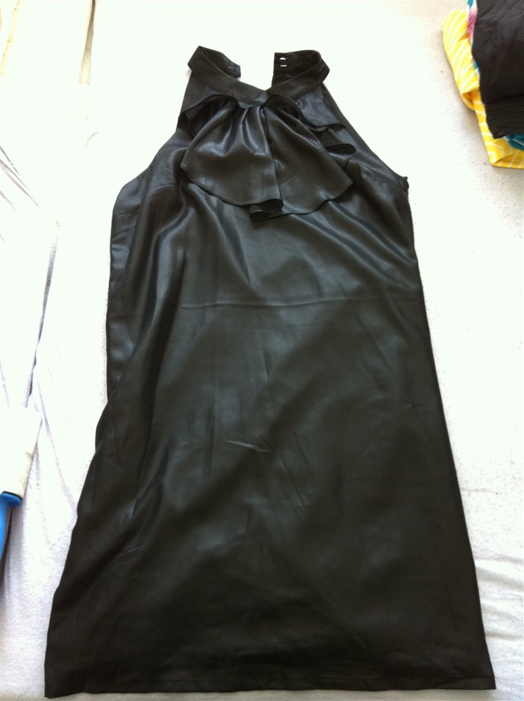 Billede 56+57: Veromoda sort kjole i skinnende stof, som godt kunne ligne læderlook. Sødt fald foran ved brystet, og knaplukning i nakken. BYD!