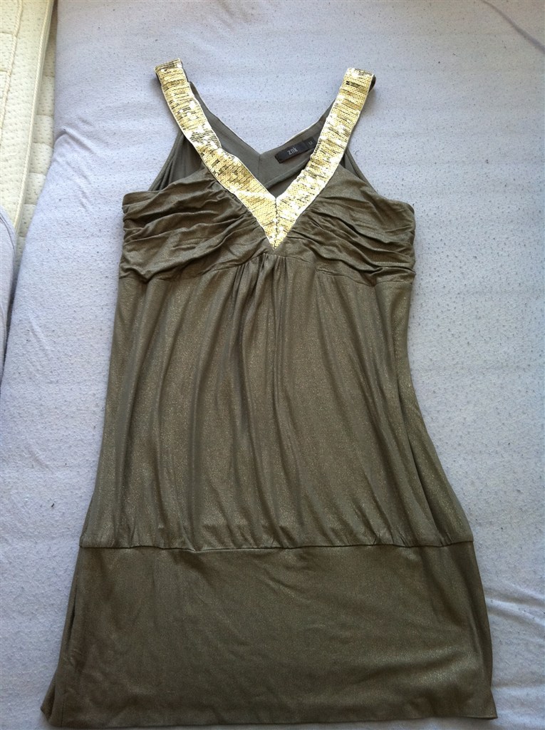 Billede 46+47. Guld dlimmer kjole med guld palietter i ukendt mærke str M/L. Aldrig brugt. BYD!