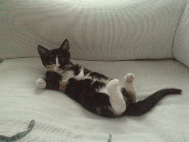 Den første er dværg og den fik vi, fordi den er overnuttet og forkert proportioneret, og vi bilder os ind, vi gjorde den en stor tjeneste, eftersom den var gårdkat og vi er ret sikre på, den ikke ville have overlevet i nærheden af en landevej. (Yep, de korte ben bærer den altså ikke så hurtigt som andre katte.)