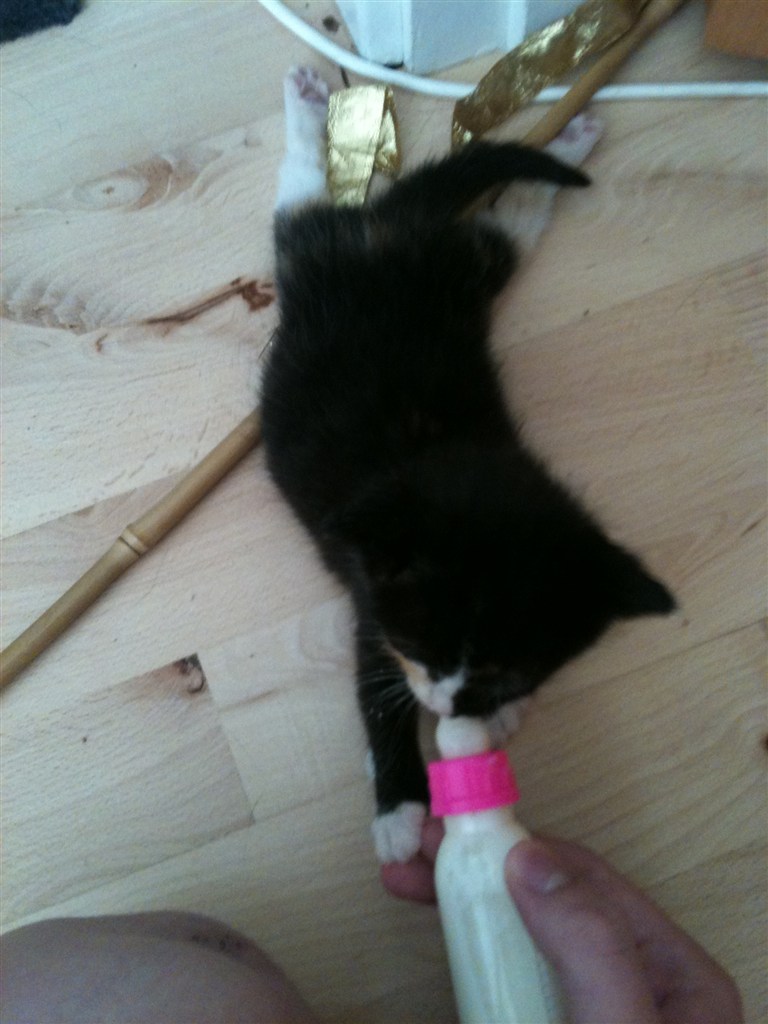 Og den femte kom dumpende! I december måned gik min forlovede en tur ved en skovsø og så en kasse flyde rundt. Han var nysgerrig og fulgte efter den. Da den kom tættere på, kunne han høre lyde og kradsen inde fra den, så han fulgte efter den længe, til den kom tættere på land. Da han kunne se, kassen ville flyde længere ud igen, hoppede han i vandet(!) for at samle kassen op. Hans ben krampede, men det lykkedes ham at få fat i kassen. Bunden røg ud, men han greb en pose inden i, og fik den bakset i land. I posen var en kulsort ca. 10 uger gammel killing. Jeg var rasende, da jeg hørte, han var hoppet i vandet i december måned, men helt ærligt, det vidner jo om hans store hjerte...