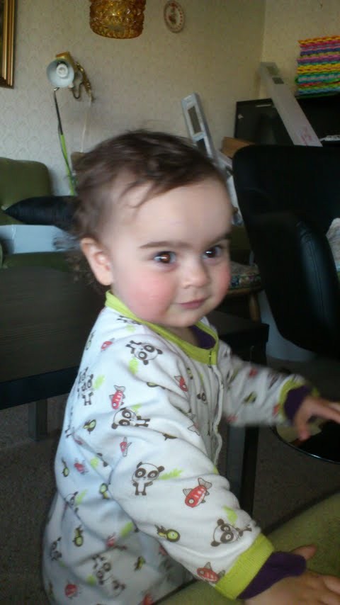 Hun skulle jo også kontrolvejes og måles, fordi hun har taget et gevaldigt dyk på begge kurver, men hun har taget 1 kg. på, siden 1 års undersøgelsen og vokset 6 cm., så det er jo fint på tre måneder - sødmælks-/smørkuren hjælper åbenbart!