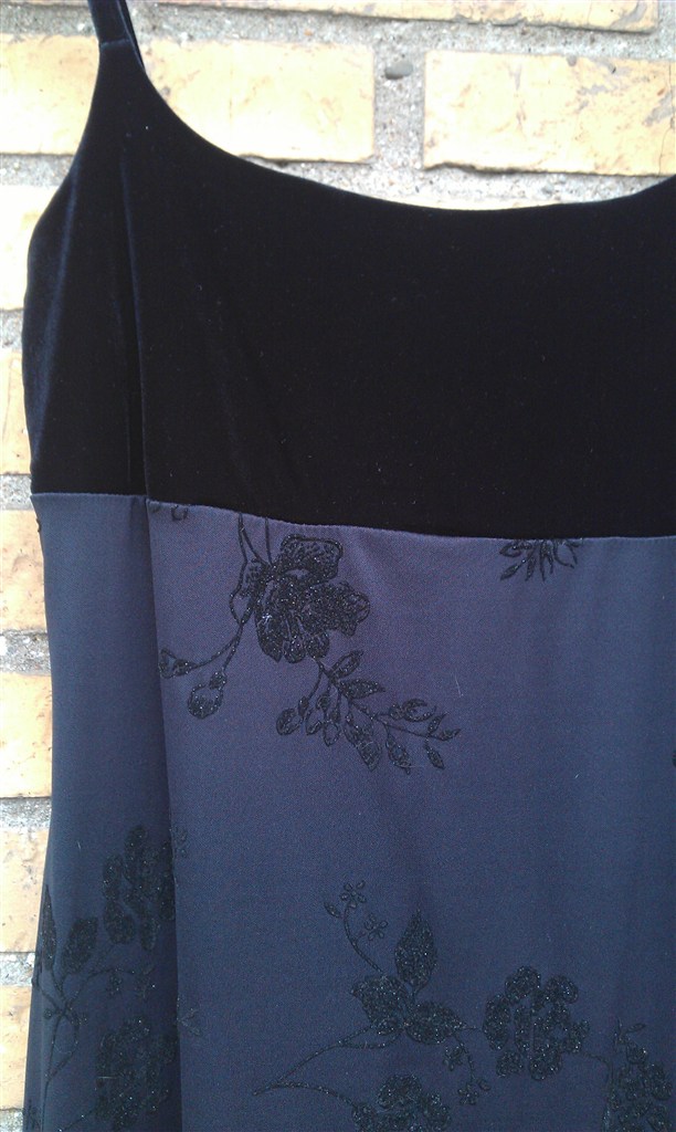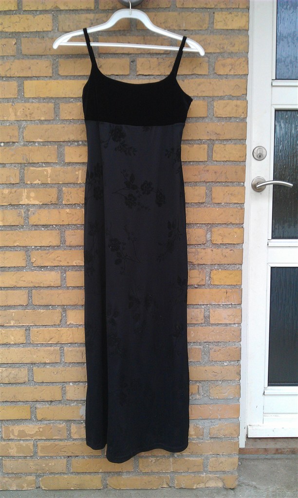Billede 1-2: Sort lang kjole str S. Mrk: Vero Moda. Sort flølj på bryst og broderier med lille sølvtrød i broderierne. Ikke brugt meget. Har bare hængt i skabet.. Pris: 100,-