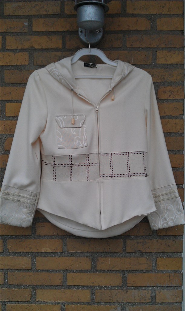 Billede 3-4: Råhvid gå-i-byen jakke str S. Mrk: Repeat. Brun tråd med lidt sølvtråd i taljen. Satinfoer i jakken. Brugt få gange. Har også bare hængt i skabet... Pris: 100,-