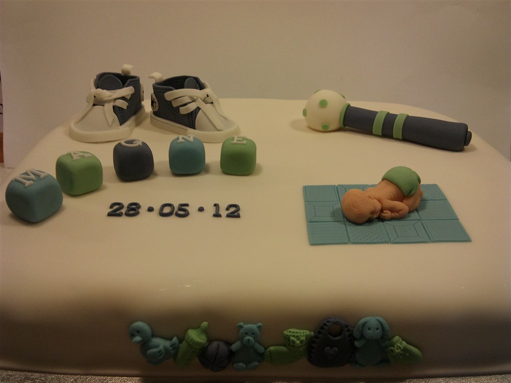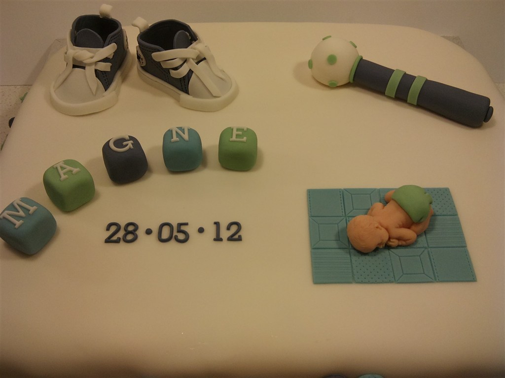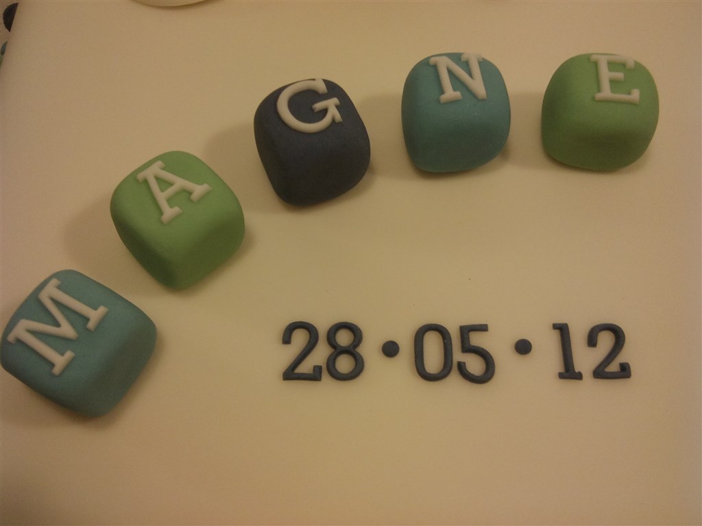 Mette ville gerne have en baby m. tæppe, rangle, sko og Magnes navn på klodser og gerne en "bamsebort" på siderne.... Så det fik hun