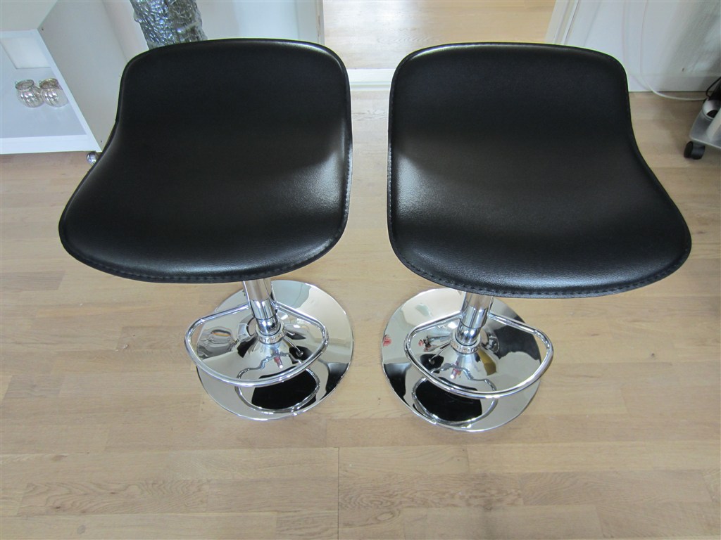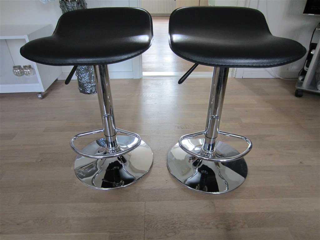 2 sorte barstole som kan hæves og sænkes i højden.