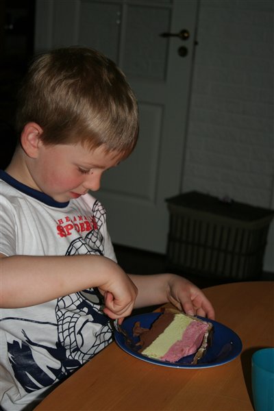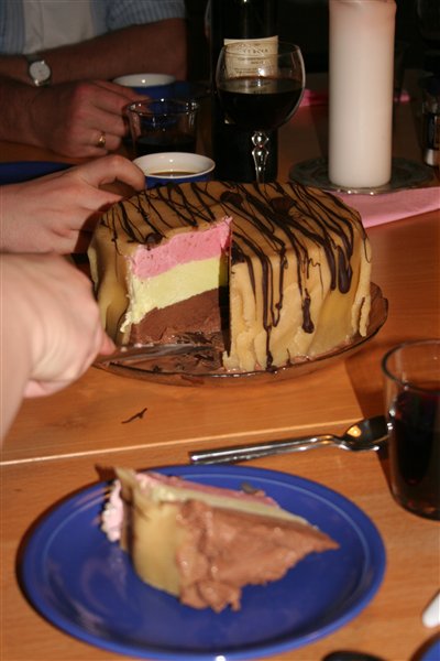 Jeps, det er is. Jeg har lavet den i tre omgange og frosset isen efter hver is. Først chokoladeis, så marcipan/pistacieis, så hindbæris, og over hele islagkage ligger et marcipanlåg. Mums!