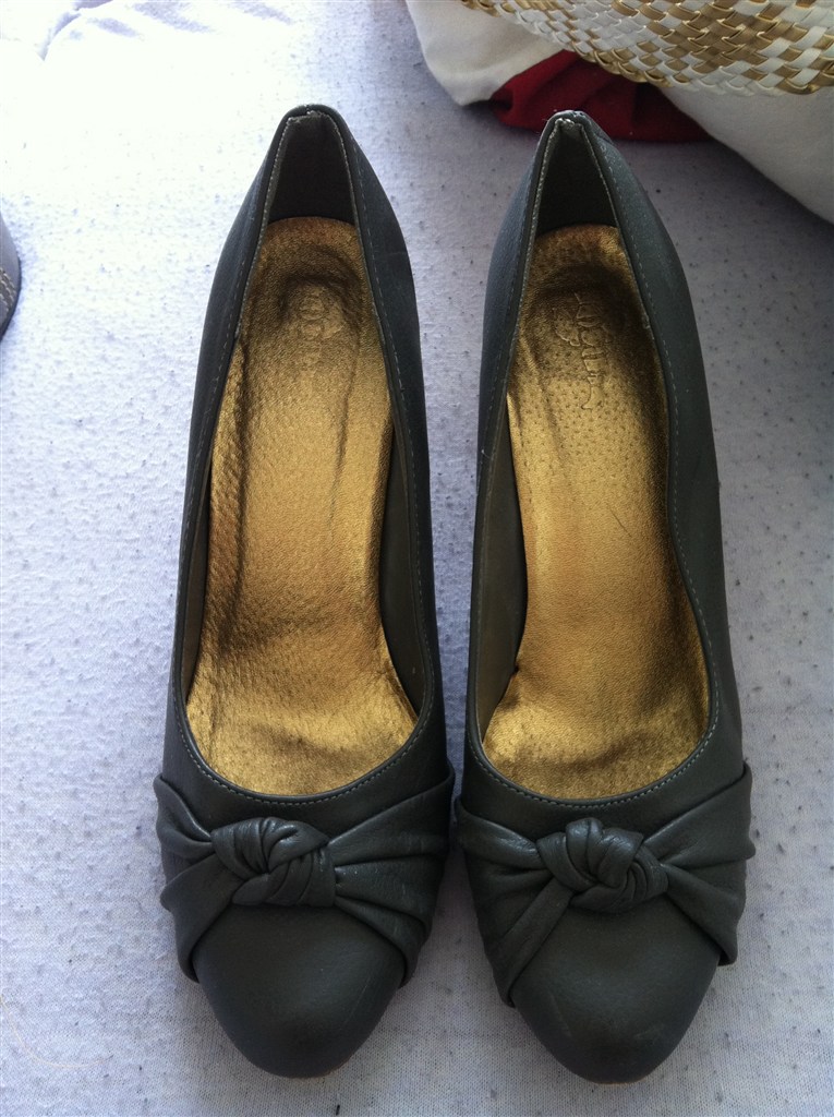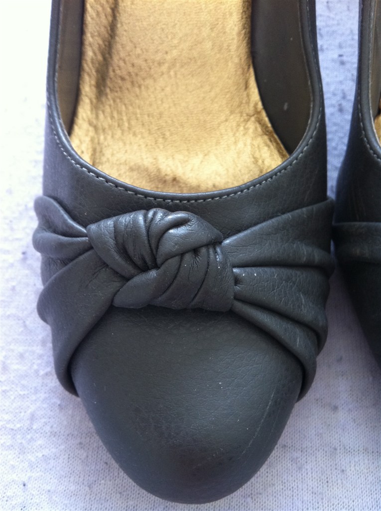 Billede 3+4+5: Fede stiletter fra Pieces i mørkgrå, med knude sløjfe, brugt en gang, men desværre et nummer for lille. Der er kommet et lille hak bagpå den ene hæl, men ellers står de som nye! Str 39.